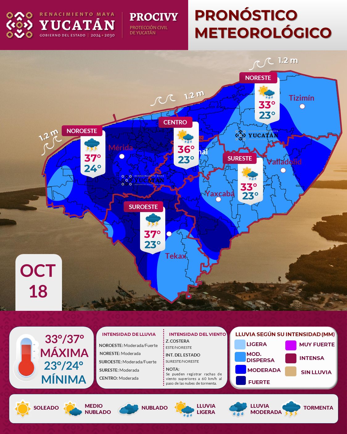 Para este sábado 18 de octubre, debido al ingreso de aire marítimo tropical y el establecimiento de una vaguada sobre la Península de Yucatán, se espera lluvia moderada y fuerte acompañada de rachas de viento y actividad eléctrica en el transcurso del mediodía sobre los municipios de Valladolid, Tizimín y aledaños; mientras que en Izamal, Mérida, Hunucmá y alrededores, se registrará después de las 13:00 horas.