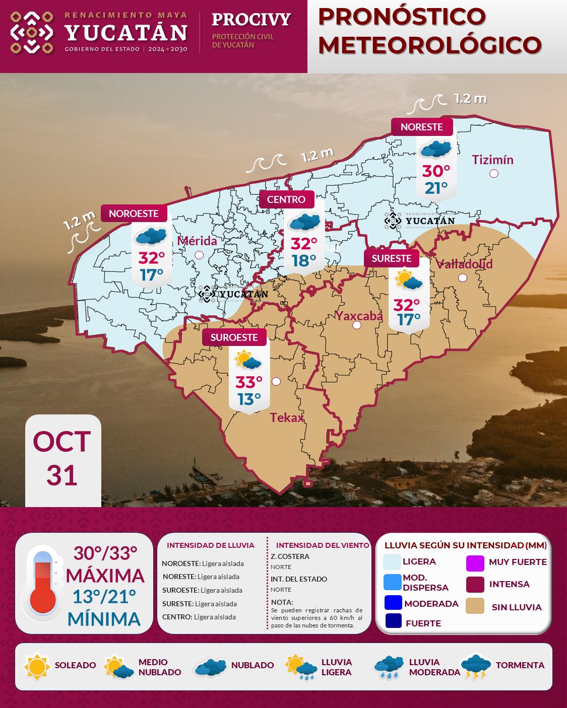 También prevalecerá cielo nublado con la presencia de lluvia ligera en municipios del noreste, centro y noroeste, así como llovizna ocasional en el sureste y suroeste del estado.
