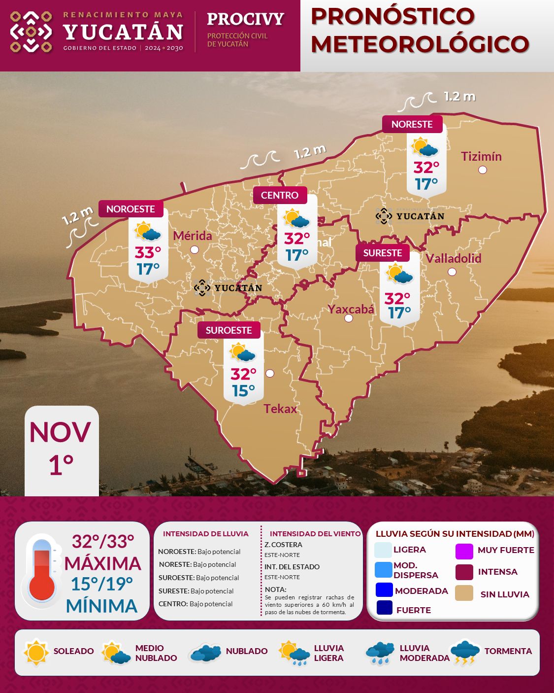 Para este sábado 1° de noviembre, en el estado de Yucatán prevalecerá ambiente cálido en el día y fresco por la noche y el amanecer; se espera temperatura máxima de 32°a 33°C en el interior del estado y de 27° a 29°C en la zona costera.