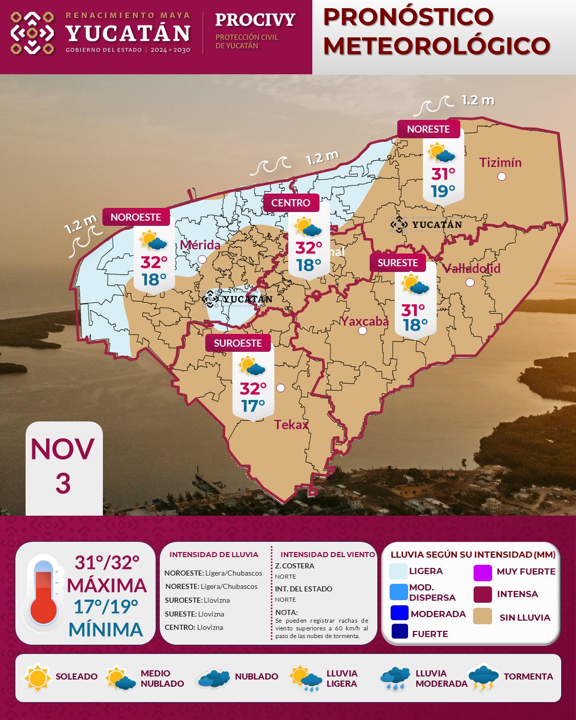 También, tendremos lluvia ligera con chubascos dispersos en el noroeste y noreste del estado y llovizna ocasional en el centro y sur de Yucatán.