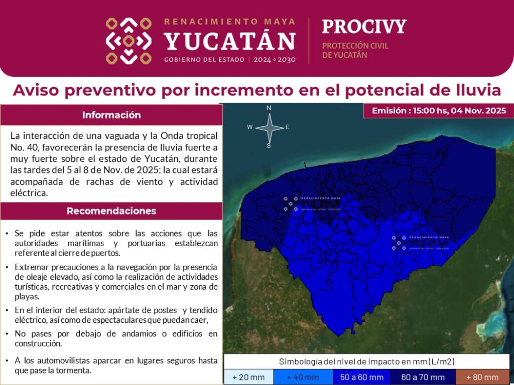 La proximidad de la Onda Tropical No. 40, favorecerá la presencia de lluvia moderada y fuerte en los municipios del noreste y sureste del estado, mientras que en municipios del centro, suroeste y noreste se registrará de intensidad ligera y moderada dispersa.