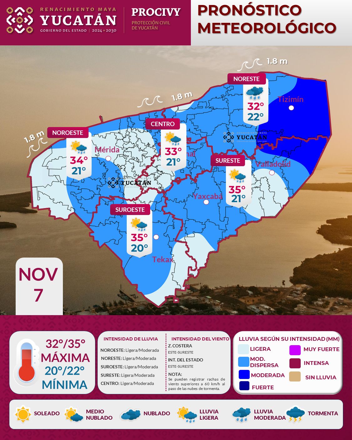 Para este viernes 7 de noviembre, el ingreso de aire marítimo tropical, el establecimiento de una vaguada en superficie e inestabilidad atmosférica superior, favorecerán la presencia de lluvia ligera y moderada dispersa acompañada de rachas de viento y actividad eléctrica por la tarde.