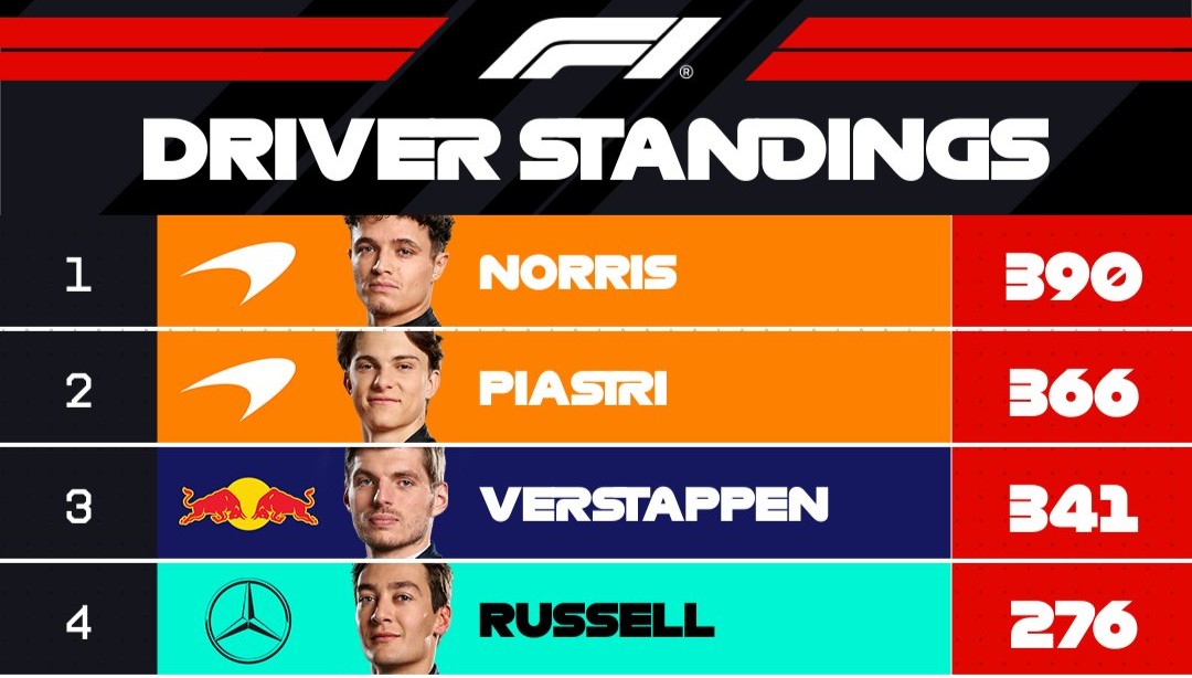Con el quinto lugar de Piastri, el australiano suma 366 unidades, quedando a 24 puntos de Norris, mientras que Verstappen se mantiene en la tercera posición con 341 puntos.
