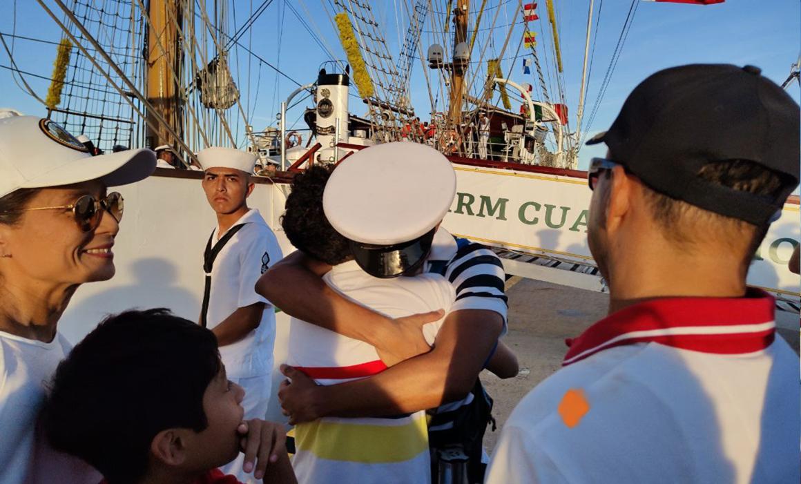 El arribo del Buque Escuela ARM Cuauhtémoc al puerto de Progreso estuvo marcado por escenas de emoción y orgullo. Entre los asistentes se encontraba Daisy Tamayo, madre del cadete Ángel Jesús Santos Tamayo, originario de Mérida, quien forma parte de la tripulación desde hace casi cuatro años.