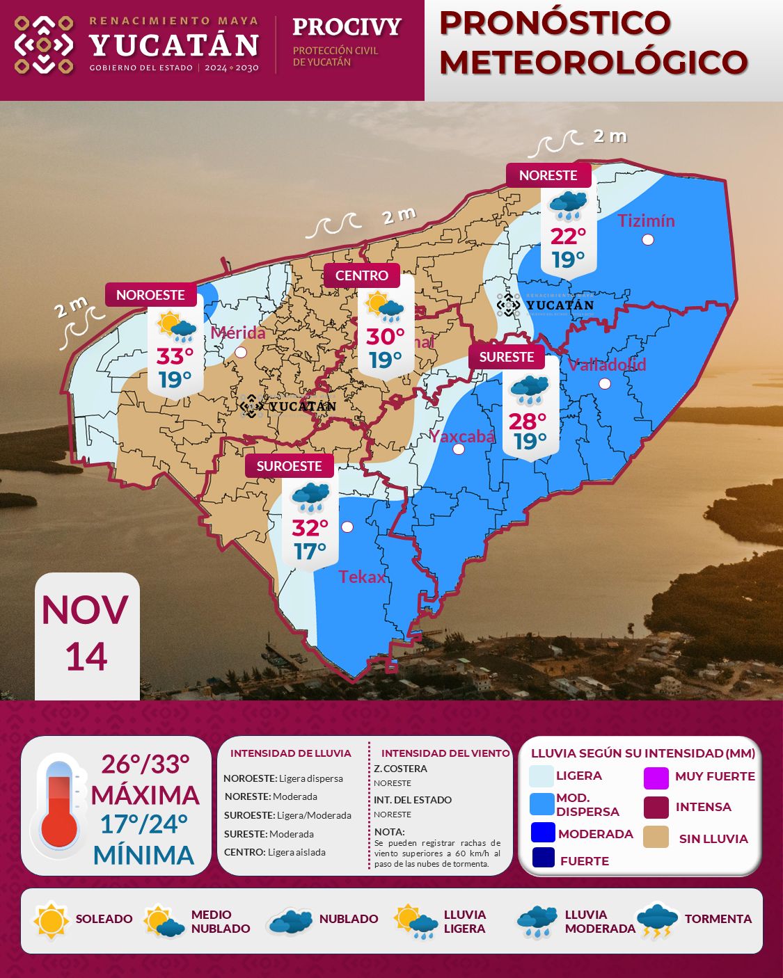 Para este viernes 14 de noviembre, el ingreso de aire marítimo, favorecerá ambiente cálido en el día y fresco por la noche y el amanecer; así como la presencia de lluvia ligera por la mañana en el noroeste de Yucatán y moderada por la tarde en municipios del noreste y sureste.