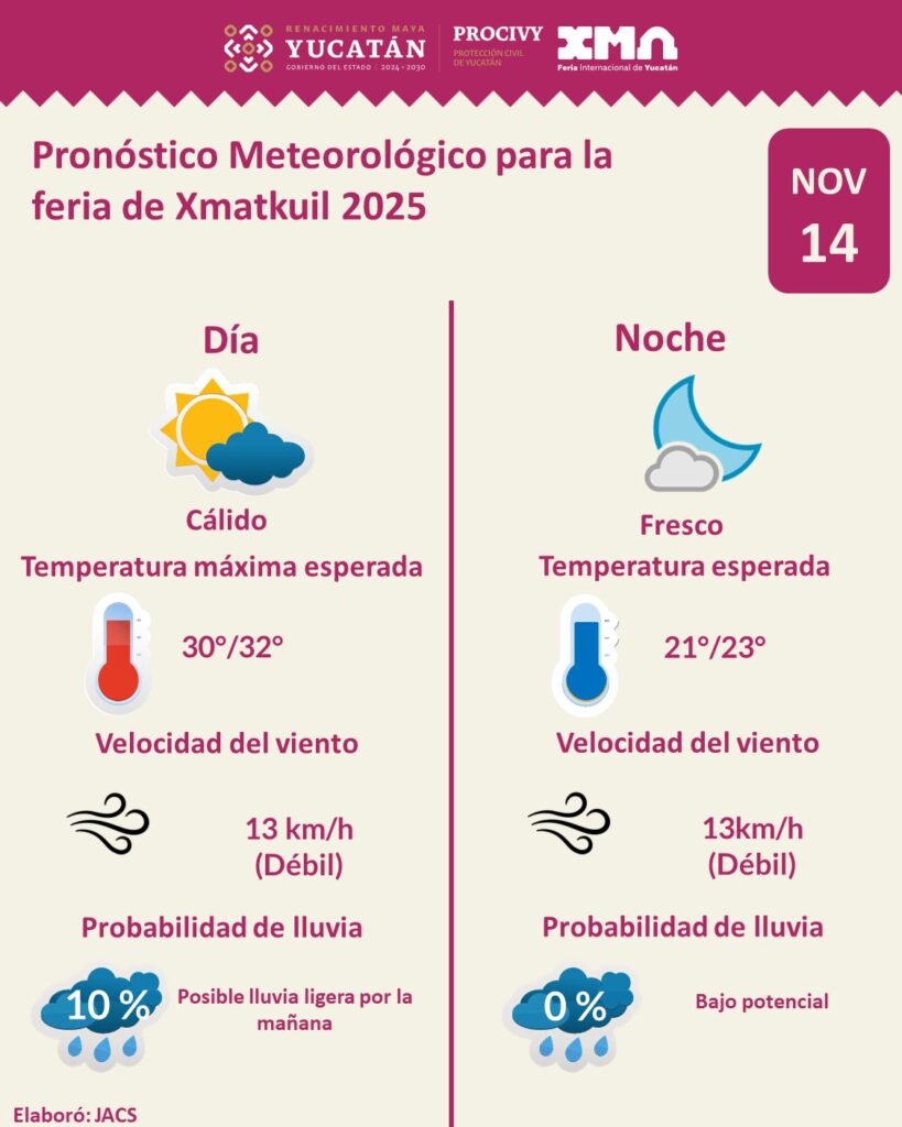 Para este viernes 14 de noviembre en la Feria Yucatán Xmatkuil 2025, predominará cielo medio nublado con probabilidad de lluvia ligera por la mañana.
