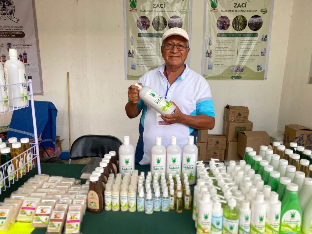 Gaspar Chávez, del Laboratorio Agroindustrial Aloe Vera, presenta bebidas saludables, protectores solares, champús y jabones medicinales.