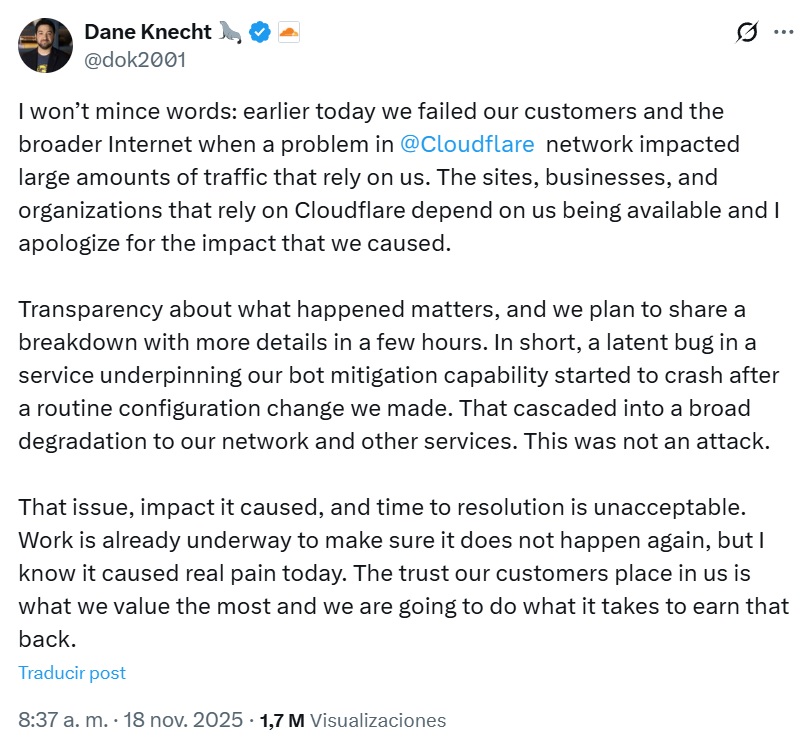 Hoy temprano fallamos a nuestros clientes y a Internet en general cuando un problema en la red de Cloudflare afectó grandes cantidades de tráfico que dependen de nosotros". Además, detalló que "un error latente en un servicio que sustenta nuestra capacidad de mitigación de bots comenzó a fallar después de un cambio de configuración rutinario".