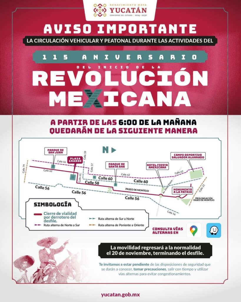 El Gobierno del Estado de Yucatán informó que este jueves 20 de noviembre el tránsito vehicular permanecerá cerrado en diversas calles del Centro de Mérida con motivo del desfile conmemorativo del 115 aniversario del inicio de la Revolución Mexicana. El cierre se mantendrá de 7:00 a 10:30 a.m., y la movilidad regresará a la normalidad al concluir el evento.