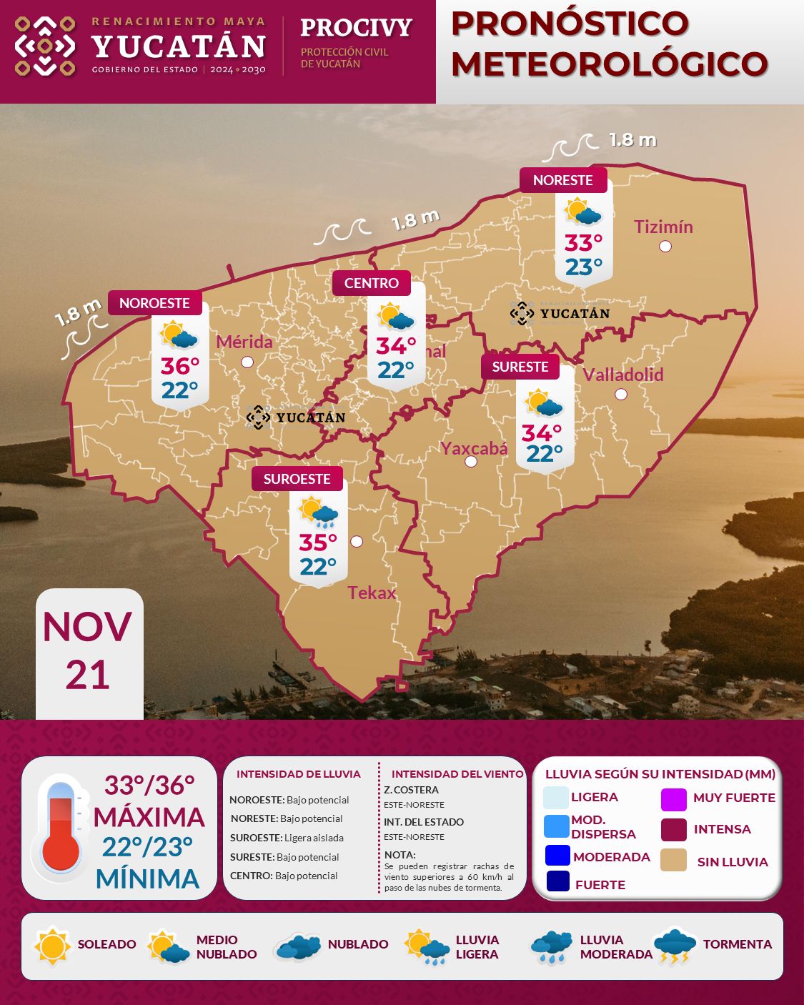 Para este viernes 21 de noviembre, se espera ambiente muy caluroso en el estado de Yucatán, con temperatura máxima de 34 a 36°C en el interior del estado y de 30 a 32°C en los municipios costeros.