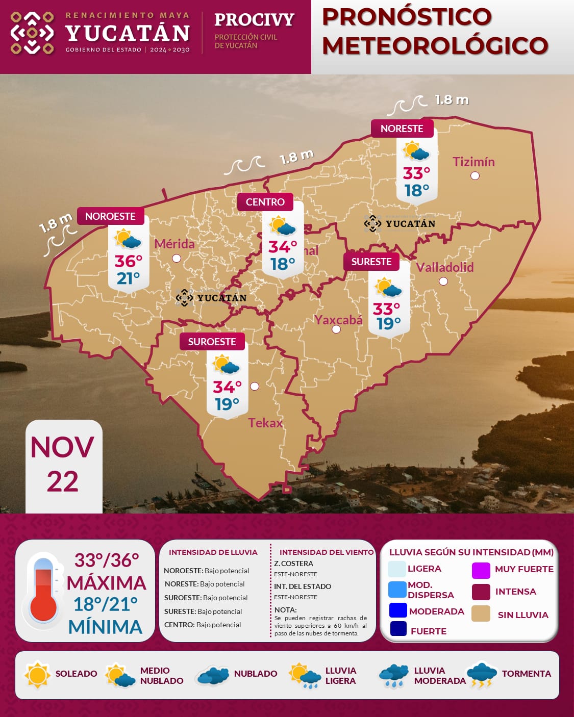 Para este sábado 22 de noviembre, se espera ambiente muy caluroso en el estado de Yucatán, con temperatura máxima de 33 a 36°C en el interior del estado y de 30 a 32°C en los municipios costeros.