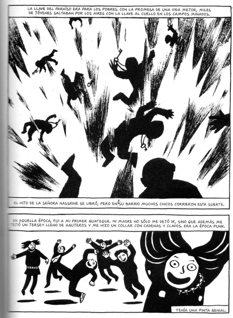 Además, Satrapi cuenta su historia mediante capítulos cortos que funcionan como pequeñas viñetas de memoria. Cada escena captura un momento clave: una charla con la abuela, una bomba en el vecindario, un comentario racista en Europa o una discusión con las autoridades universitarias. Este formato fragmentado mantiene un ritmo ágil y facilita que Persépolis conecte con lectores que no suelen acercarse al cómic.
