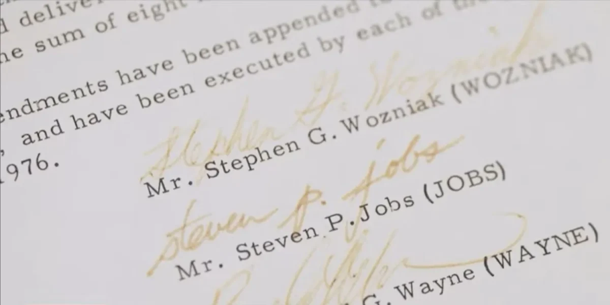 Este documento histórico lleva las firmas de Steve JobsSteve Wozniak y el menos conocido tercer cofundador, Ronald Wayne. El texto establece las participaciones iniciales de propiedad: 45% para Jobs, 45% para Wozniak y 10% para Wayne.