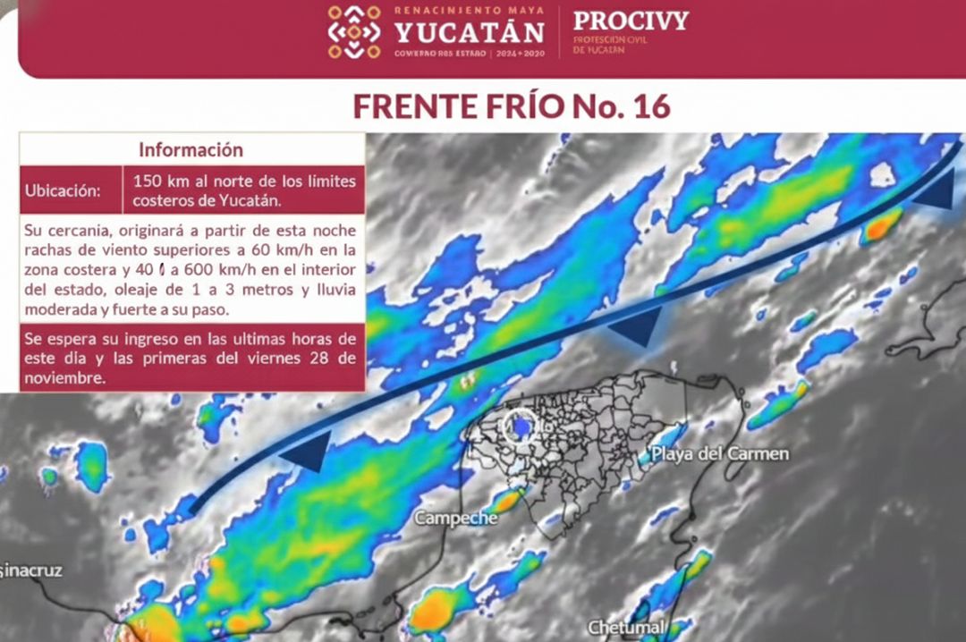 Protección Civil de Yucatán (Procivy) emitió un aviso meteorológico ante la inminente llegada del sistema frontal a la región. Según el reporte oficial, el Frente Frío No. 16 se localiza actualmente a 150 kilómetros de los límites costeros de la entidad, situación que comenzará a generar efectos significativos a partir de esta noche.