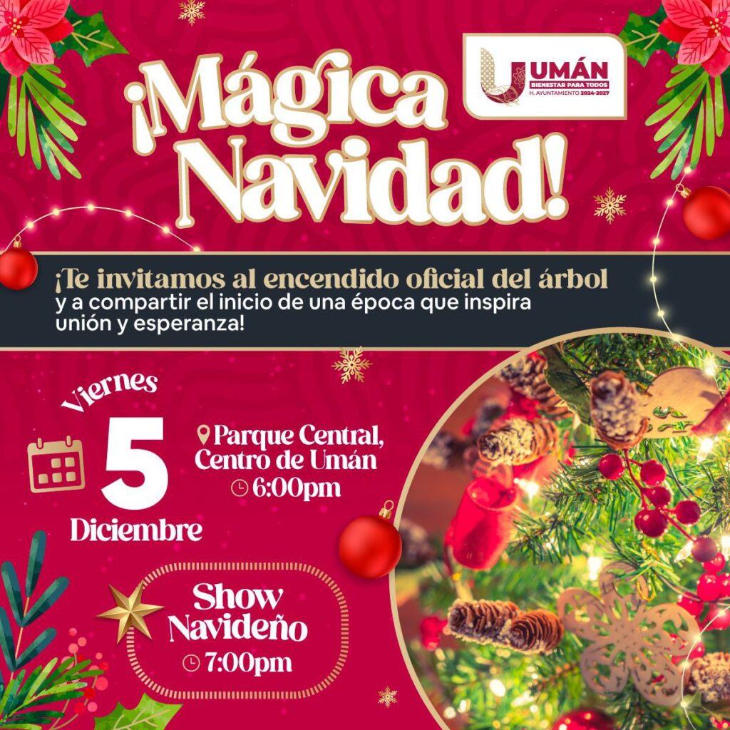 Con el propósito de iniciar oficialmente las celebraciones de fin de año, el H. Ayuntamiento de Umán anunció que este viernes 5 de diciembre se llevará a cabo el tradicional Encendido del Árbol Navideño en el corazón del municipio. Este evento marca el comienzo de la temporada decembrina y promete reunir a las familias locales en una jornada llena de luz y entretenimiento.