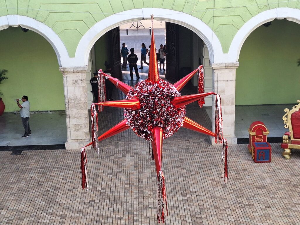 El inmueble gubernamental muestra una decoración que incluye una chimenea, duendes, obsequios y piñatas que reciben a quienes acuden a admirar el conjunto.