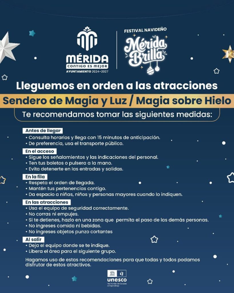 Para quienes buscan una experiencia distinta, el festival instala la pista de hielo “Magia sobre Hielo” en Paseo de Montejo con acceso gratuito mediante boletos controlados por el Ayuntamiento.