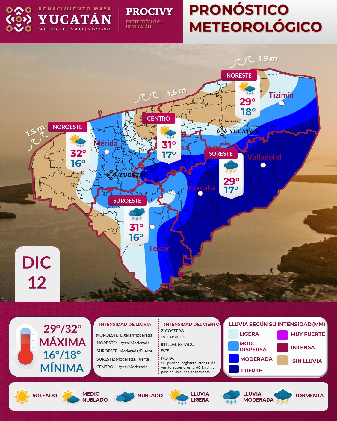 Para este viernes 12 de diciembre, la entrada de humedad proveniente del Mar Caribe y el establecimiento de una vaguada, mantendrán el ambiente cálido en la región con temperaturas máximas de 30 a 32 °C en municipios del centro y noroeste del estado, incluida la capital, y de 28 a 30°C, en el oriente y sur.
