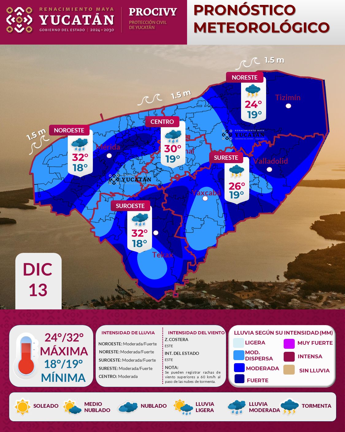 Para este sábado 13 de diciembre, debido al ingreso de humedad proveniente del Mar Caribe y el establecimiento de una vaguada, se espera lluvia ligera por la mañana y fuerte en el transcurso del mediodía en municipios del noreste, noroeste y centro de Yucatán, incluidos Tizimín, Mérida e Izamal.