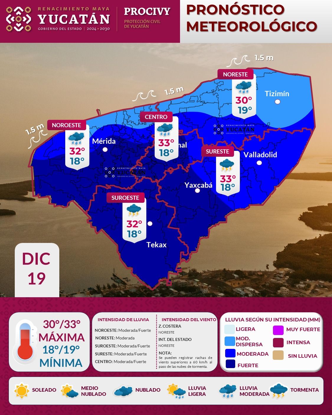Para este viernes 19 de diciembre, se espera lluvia ligera y chubascos poco antes del mediodía en municipios del noreste y noroeste del estado de Yucatán, incluido el municipio de Mérida; mientras que, en los municipios del sureste, centro y suroeste, la lluvia se registrará después de las 15:00 horas acompañada de rachas de viento y actividad eléctrica.