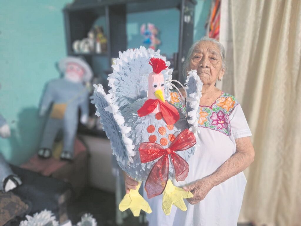 Un ejemplo de esta tradición viva es María Mercedes Canul Dzul, conocida como doña Mechita, quien a sus 96 años continúa dedicada a la elaboración de piñatas desde su hogar en la colonia Chuburná de Hidalgo. Con la misma paciencia y entusiasmo de hace cuatro décadas, en vísperas de Nochebuena mantiene su rutina diaria dando forma a sus característicos pavos piñata, piezas únicas que combinan creatividad, memoria colectiva y espíritu festivo.
