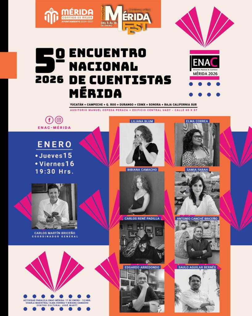 Mérida reafirma su vocación cultural con la realización de la quinta edición del Encuentro Nacional de Cuentistas (ENAC-Mérida 2026), que se llevará a cabo los días jueves 15 y viernes 16 de enero, a las 7:30 de la noche, en el Auditorio Manuel Cepeda Peraza del Edificio Central de la Universidad Autónoma de Yucatán (UADY), como parte de las actividades del Mérida Fest 2026.