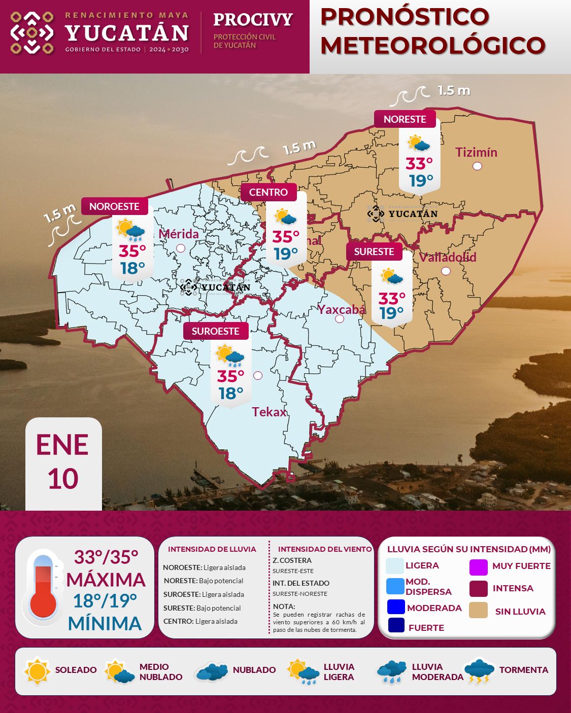 Para este sábado 10 de enero, el ingreso de aire marítimo tropical procedente del Mar Caribe y el establecimiento de una vaguada, favorecerán ambiente caluroso sobre el estado de Yucatán, con temperatura máxima de 33° a 35°C en el interior del estado y de 29° a 31°C en la zona costera.