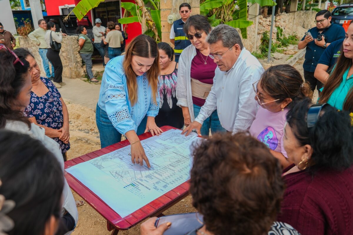 Acompañada del director de Obras Públicas, Sergio Chan Lugo, la presidenta municipal informó que en Cholul se intervienen 34 calles nuevas o rehabilitadas, equivalentes a más de 4 kilómetros de vialidades.