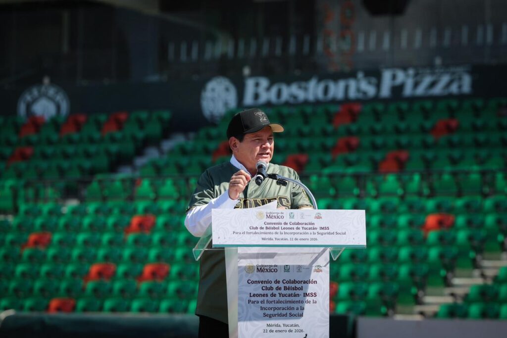 En este sentido, expresó: “La firma de este convenio entre el IMSS y el Club de Béisbol Leones de Yucatán, orgullo de nuestro estado, abre una puerta para que personas trabajadoras independientes o por cuenta propia puedan incorporarse a la formalidad y contar con atención médica y prestaciones”.