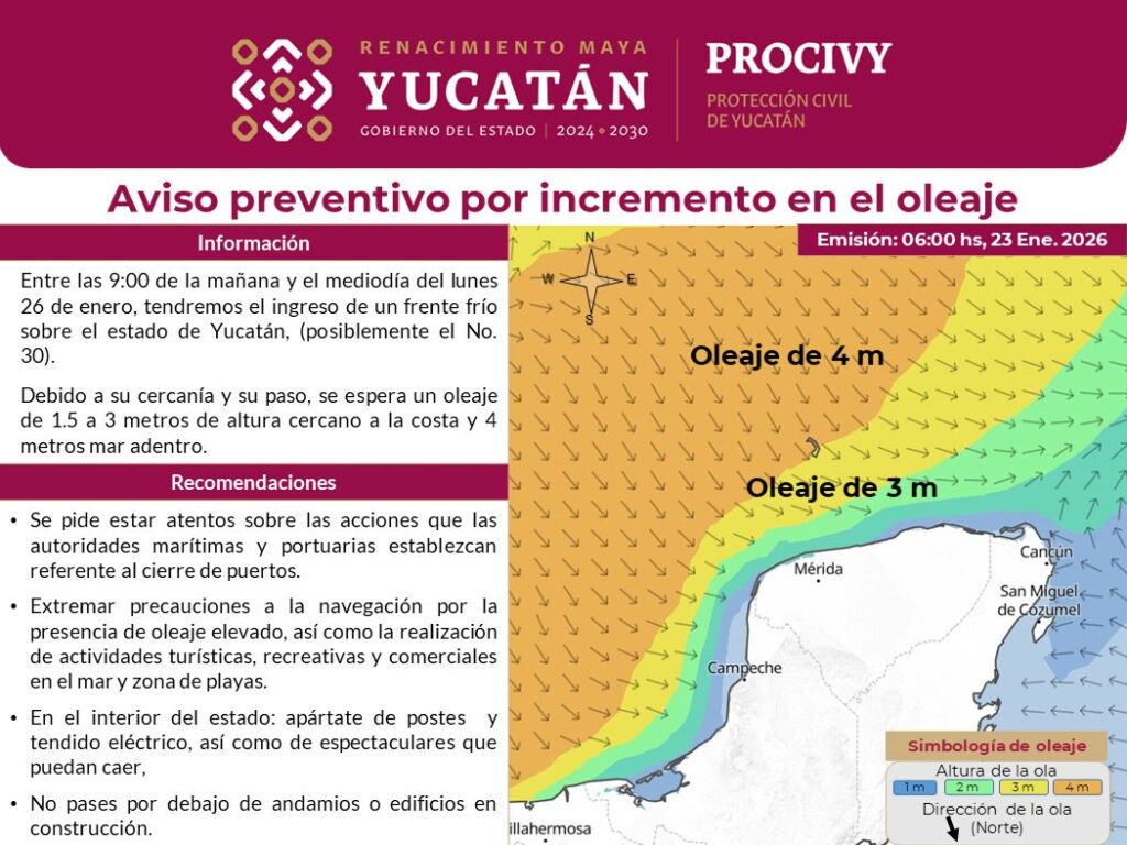 Entre las 9:00 de la mañana y el mediodía del lunes 26 de enero, tendremos el ingreso de un Frente Frío sobre el estado de Yucatán.