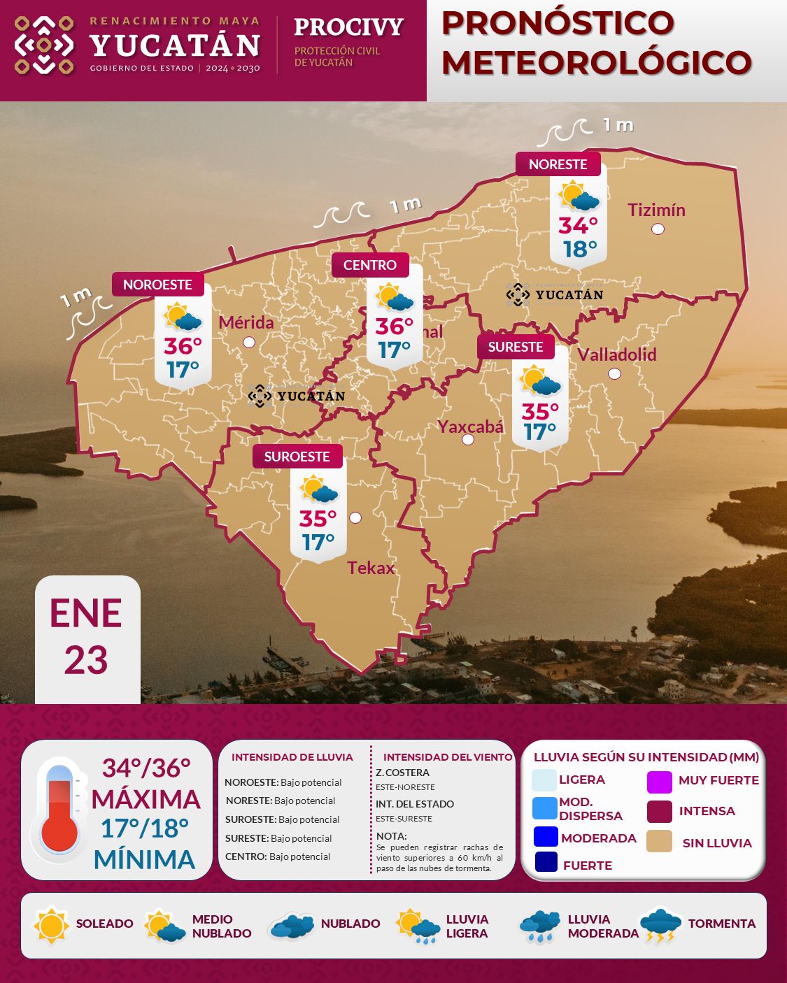 Para este viernes 23 de enero, el ingreso de humedad proveniente del Mar Caribe y el establecimiento de una vaguada, mantendrán el ambiente caluroso en el día, con temperatura máxima de 34 a 36°C, mientras que por la noche y el amanecer esperamos ambiente fresco con temperaturas mínimas de 16° a 20°C.