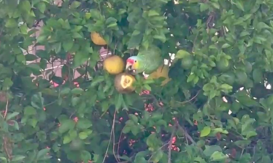 El Centro de Difusión y Conservación Ambiental Proyecto Santa María difundió recientemente un video donde se observa a un loro "cachetes amarillos" (Amazona autumnalis) alimentándose de una naranja agria en un predio particular de la ciudad de Mérida.