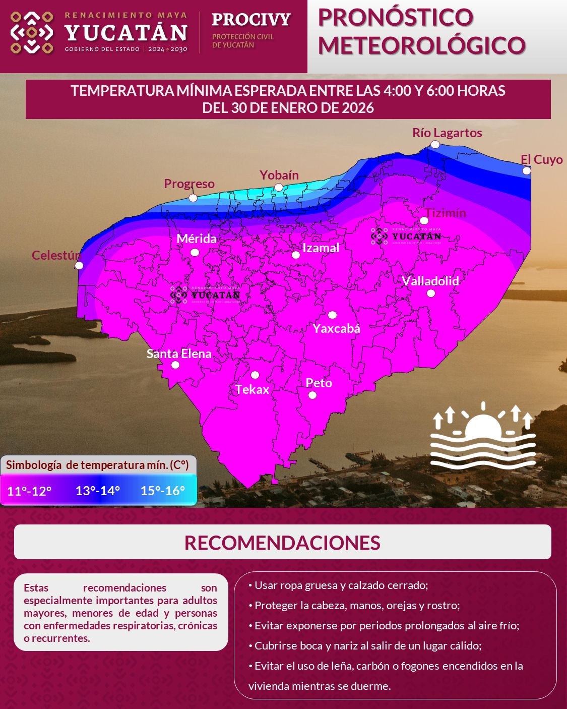 La Coordinación Estatal de Protección Civil de Yucatán (Procivy) difundió un pronóstico meteorológico sobre la temperatura mínima esperada entre las 4:00 y 6:00 horas del 30 de enero de 2026. Durante este periodo, se prevé un descenso térmico relevante en diferentes zonas del estado. Las autoridades llamaron a la población a mantenerse informada ante el ambiente frío de la madrugada.