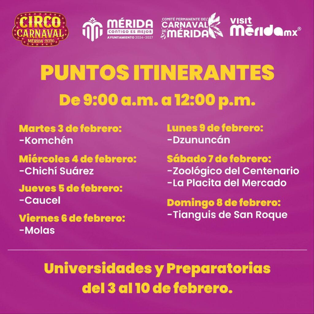 Asimismo, la programación itinerante continuará el sábado 7 de febrero en el Zoológico del Centenario y en La Placita del Mercado. Posteriormente, el domingo 8 de febrero los módulos llegarán al Tianguis de San Roque, concluyendo estas visitas el lunes 9 de febrero en la localidad de Dzununcán.