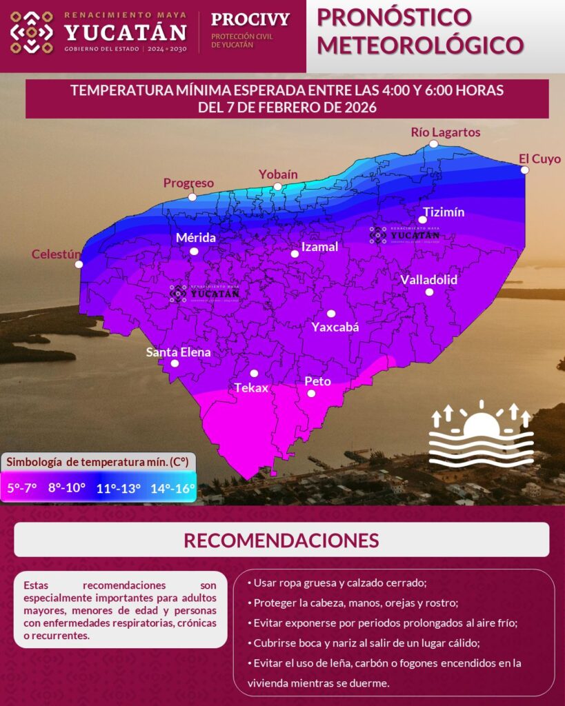 El amanecer de mañana sábado 7 de febrero será muy frío, se espera temperatura mínima de 5 a 7 °C en los municipios del sur del estado, como Tzucacab, Peto, Chacsinkín, Tixmehuac, Akil, Oxkutzcab, Ticul, Maní, Dzán y áreas colindantes, asi como de 8 a 14°C en Mérida, Umán, Kanasín, Izamal, Motul, Homún, Tixcacalcupul, Valladolid, Tizimín y municipios aledaños, mientras que en la costa podrían registrarse entre 14 y 16°C.