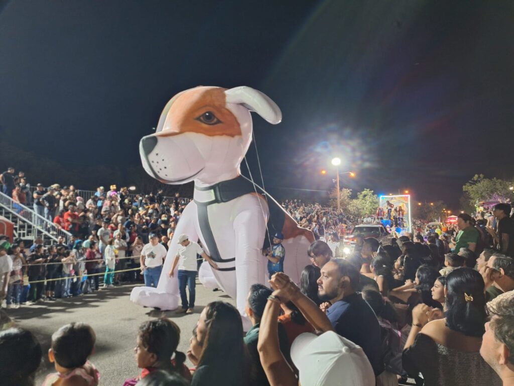 A cada paso del desfile, los participantes lanzaban obsequios al público: bolsas de galletas, refrescos y artículos promocionales volaban por los aires, provocando risas, aplausos y la inevitable competencia amistosa por atrapar algo.