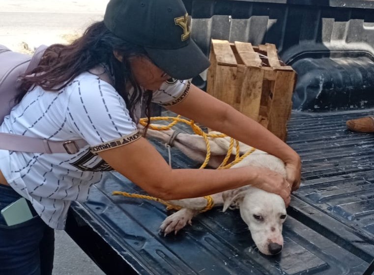 Un perrito mestizo de color blanco fue rescatado tras quedar atorado entre una malla ciclónica en el fraccionamiento Piedra de Agua, en el municipio de Umán.