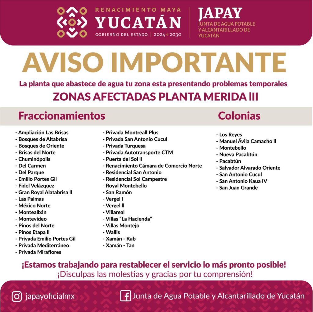 La Junta de Agua Potable y Alcantarillado de Yucatán (Japay) informa sobre una disminución en la fuerza del suministro del vital líquido. Esta situación afecta principalmente a los sectores que dependen de la Planta Potabilizadora Mérida III.