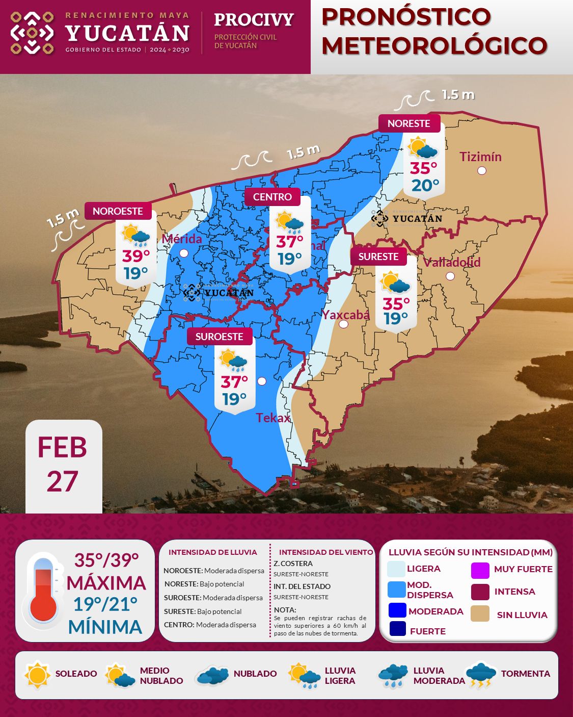Para este viernes 27 de febrero, el ingreso de aire marítimo tropical procedente del Mar Caribe y el establecimiento de una vaguada, favorecerán la presencia de lluvia moderada dispersa, acompañada de rachas de viento y posible actividad eléctrica, entre las 16:00 y 20:00 horas.