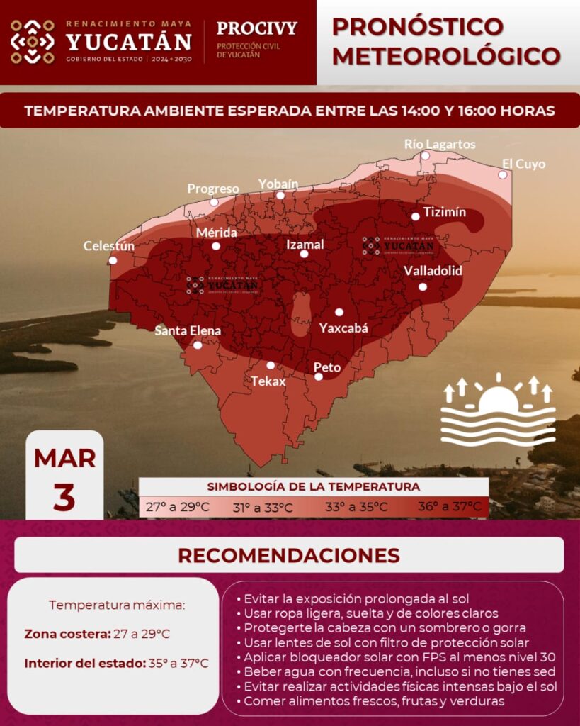 En municipios como Halachó, Maxcanú, Kopomá, Chocholá, Abalá, Tecoh, Timucuy y el sur de Mérida, los valores podrían alcanzar hasta 38 °C.