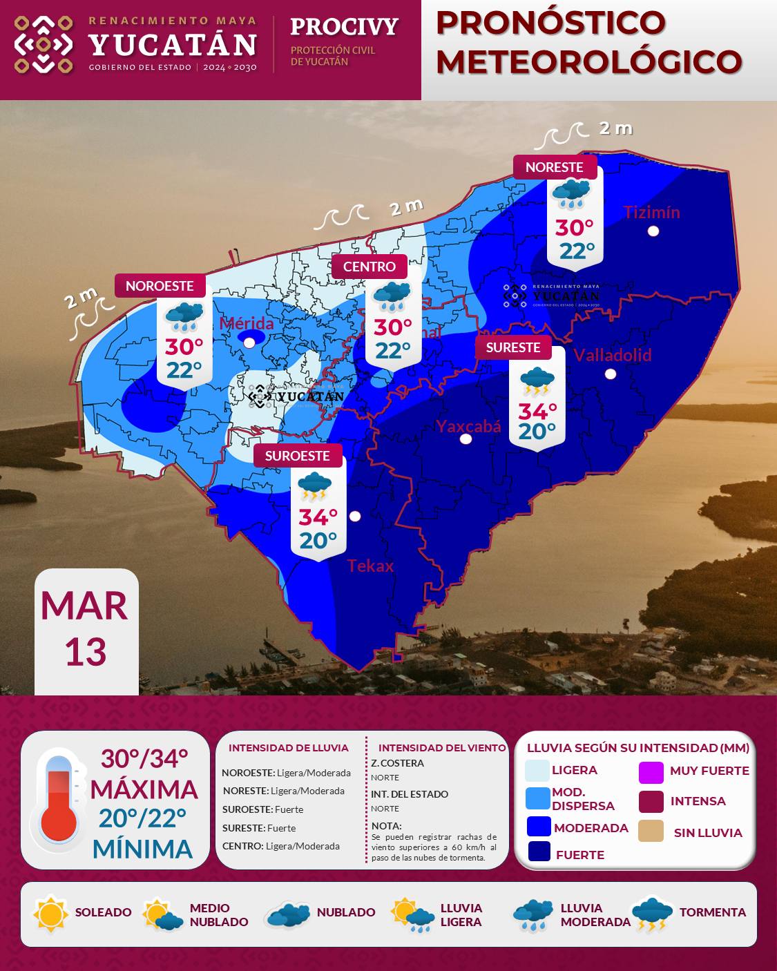 Para este viernes 13 de marzo, el Frente Frío No. 40, con características de estacionario se localiza sobre la Península de Yucatán: favorecerá en el estado de Yucatán lluvia ligera por la mañana, y moderada en el transcurso del mediodía en municipios como Motul, Izamal, Mérida, Umán, Panabá, Temax y alrededores, mientras que, en Valladolid, Tekax, Yaxcabá y aledaños la lluvia será de intensidad moderada y fuerte.