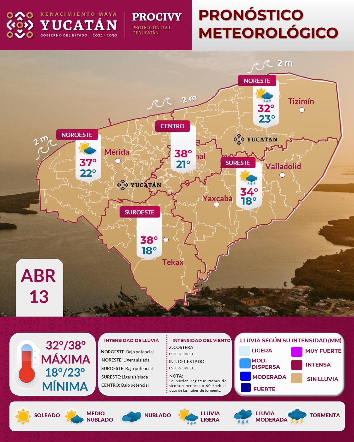 Para este lunes 13 de abril, debido a la influencia de un sistema de Alta Presión posicionado en el noreste del Golfo de México, se espera tiempo estable en la mayor parte del estado de Yucatán, sin descartar que debido al ingreso de humedad que genera su circulación y el calentamiento diurno, se registre lluvia ligera de forma aislada en Valladolid, Tizimín y alrededores.