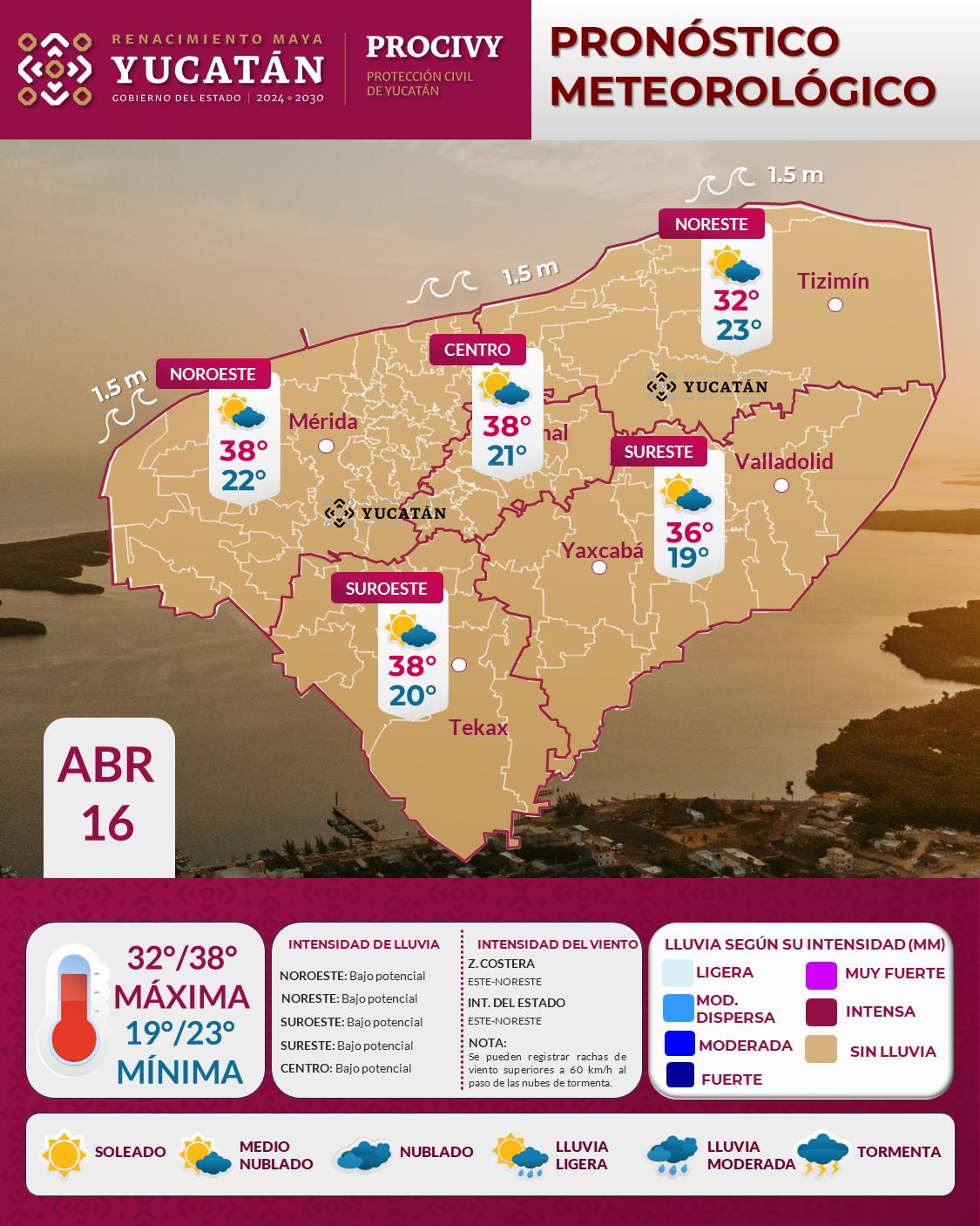 En el estado de Yucatán predominará cielo soleado a medio nublado, ambiente muy caluroso durante el día, con temperatura máxima de 32 a 38°C en municipios del interior del estado, y de 27 a 29°C en la costa.