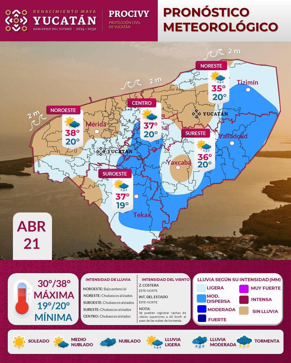 Para este martes 21 de abril, debido al ingreso de humedad proveniente del Mar Caribe y el establecimiento de una vaguada, sobre la Península de Yucatán, prevalecerá ambiente muy caluroso durante el día y de fresco a cálido por la noche y el amanecer.