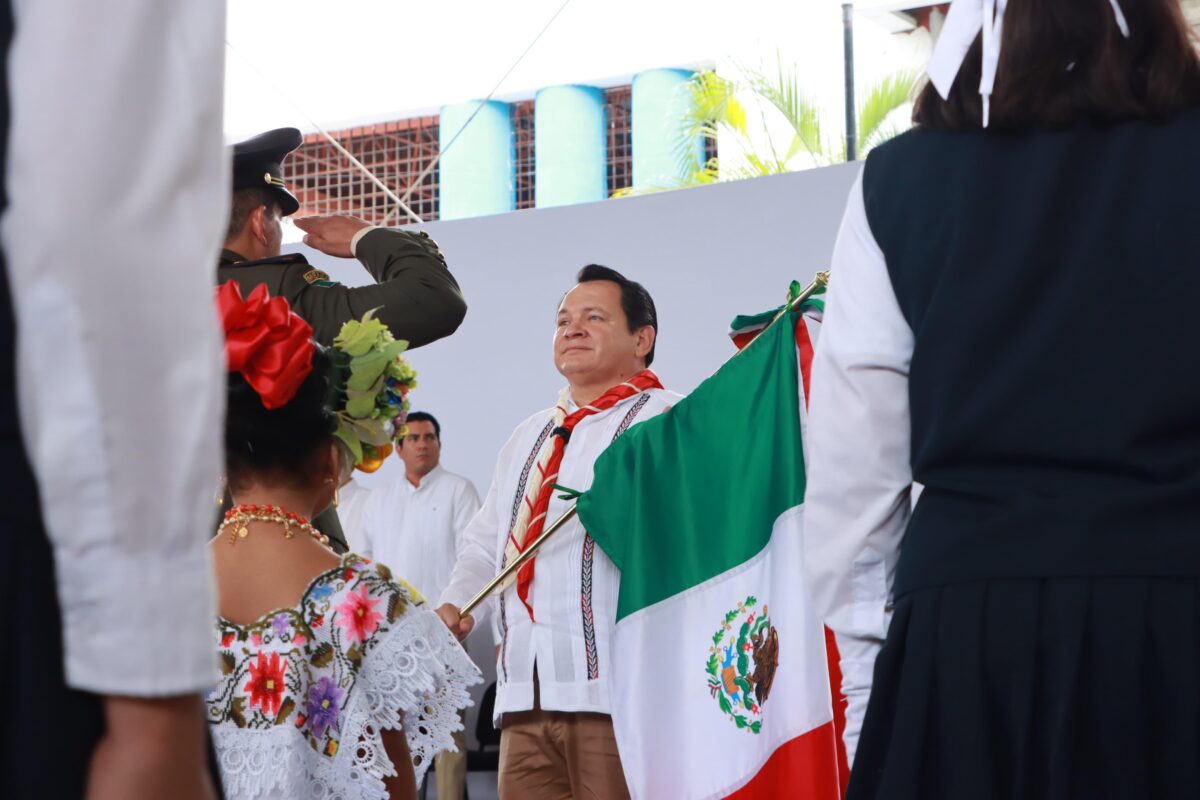 Acompañado por el gobernador por un día, el scout Samuel Alexis Chan Novelo, y por la presidenta honoraria del DIF Yucatán, Wendy Méndez Naal, Díaz Mena recordó que la Bandera Nacional es reflejo de la historia de México y un emblema de lucha y esperanza.