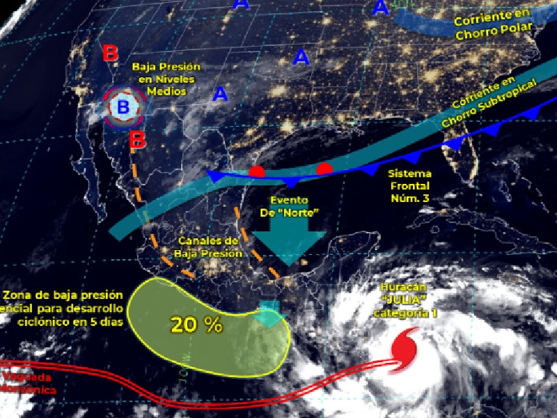 De acuerdo con la Comosión Nacional del Agua (Conagua), el ciclón tropical “Julia” se desplazará sobre Nicaragua y Honduras, sus extensas bandas nubosas reforzarán la probabilidad de lluvias fuertes a puntuales intensas en la Península de Yucatán y el sureste mexicano. Finalmente se pronostica ambiente vespertino cálido a caluroso, con temperaturas de 30 a 35°C en zonas de Baja California, Baja California Sur, Sonora, Sinaloa, Campeche y Yucatán.