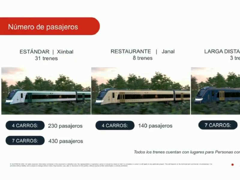 El Tren Maya contará con 42 unidades que podrán trasladar hasta 430 pasajeros en su servicio estándar. Así lo dio a conocer Maite Ramos Gómez, directora general de Alstrom México, en su participación en la “mañanera” del presidente Andrés Manuel López Obrador (AMLO).