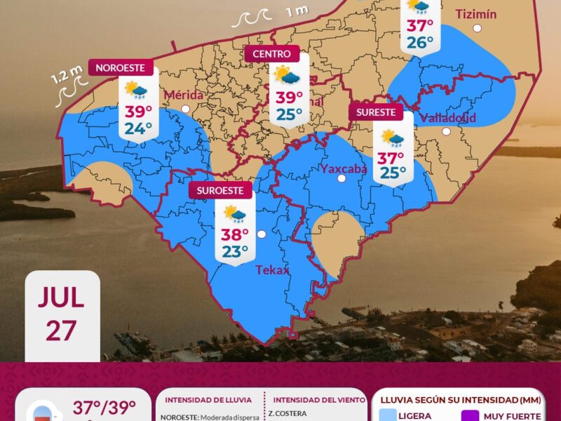 Publicado enYucatánPronóstico del clima en Yucatán para este domingo 27 de julio por 24 Horas Yucatán julio 27, 2025julio 27, 2025