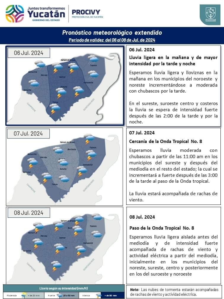 Publicado enYucatánPronóstico meteorológico del sábado al lunes 8 de julio en Yucatán. por Felix Viana julio 6, 2024julio 6, 2024