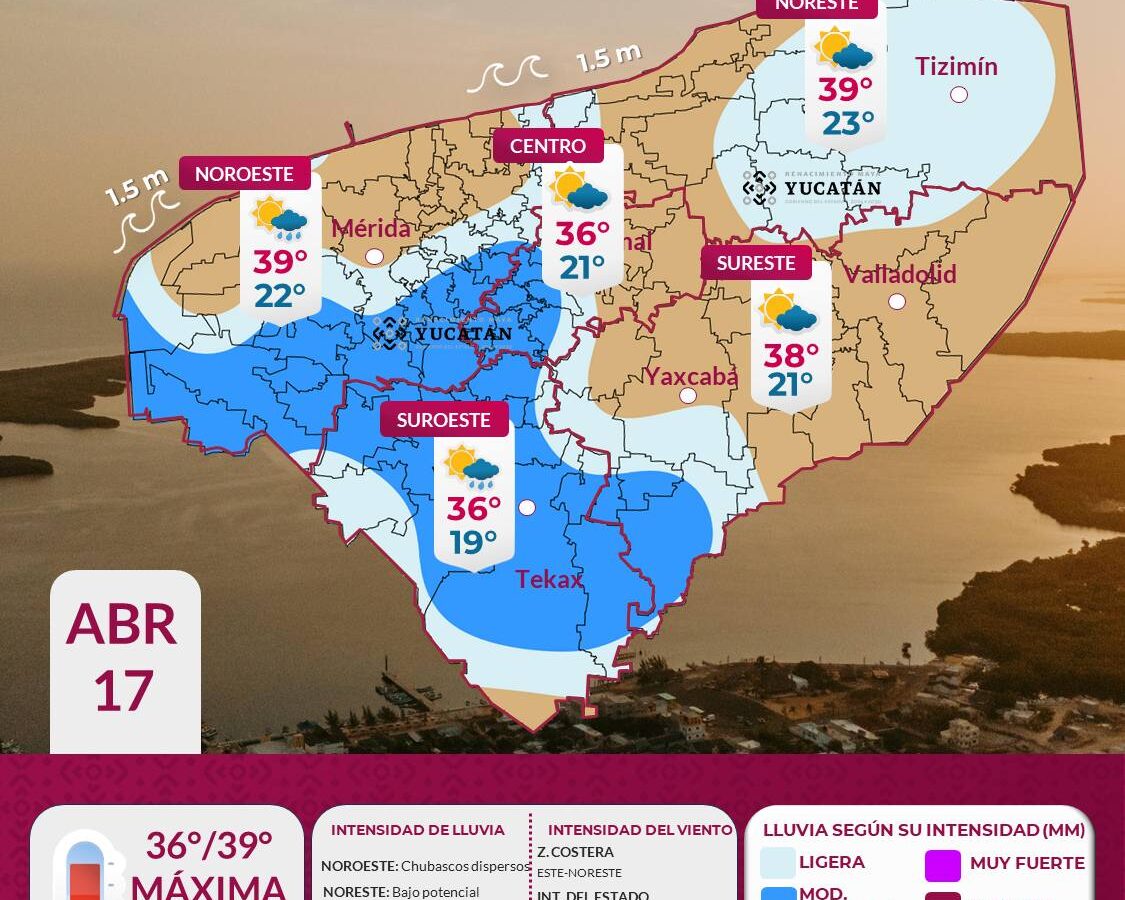 Suscríbete a nuestro canal Para este viernes 17 de abril, el sistema de Alta Presión posicionado en el noreste del Golfo de México, continuará favoreciendo ambiente muy caluroso sobre la Península de Yucatán, mientras que el ingreso de humedad y el establecimiento de una vaguada originará lluvia ligera y moderada de forma dispersa en algunas […]